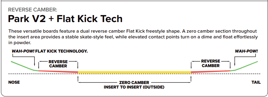 Park V2 + Flat Kick Tech – These versatile boards feature a dual reverse camber Flat Kick freestyle shape. A zero camber section throughout the insert area provides a stable skate-style feel, while elevated contact points turn on a dime and float effortlessly in powder.